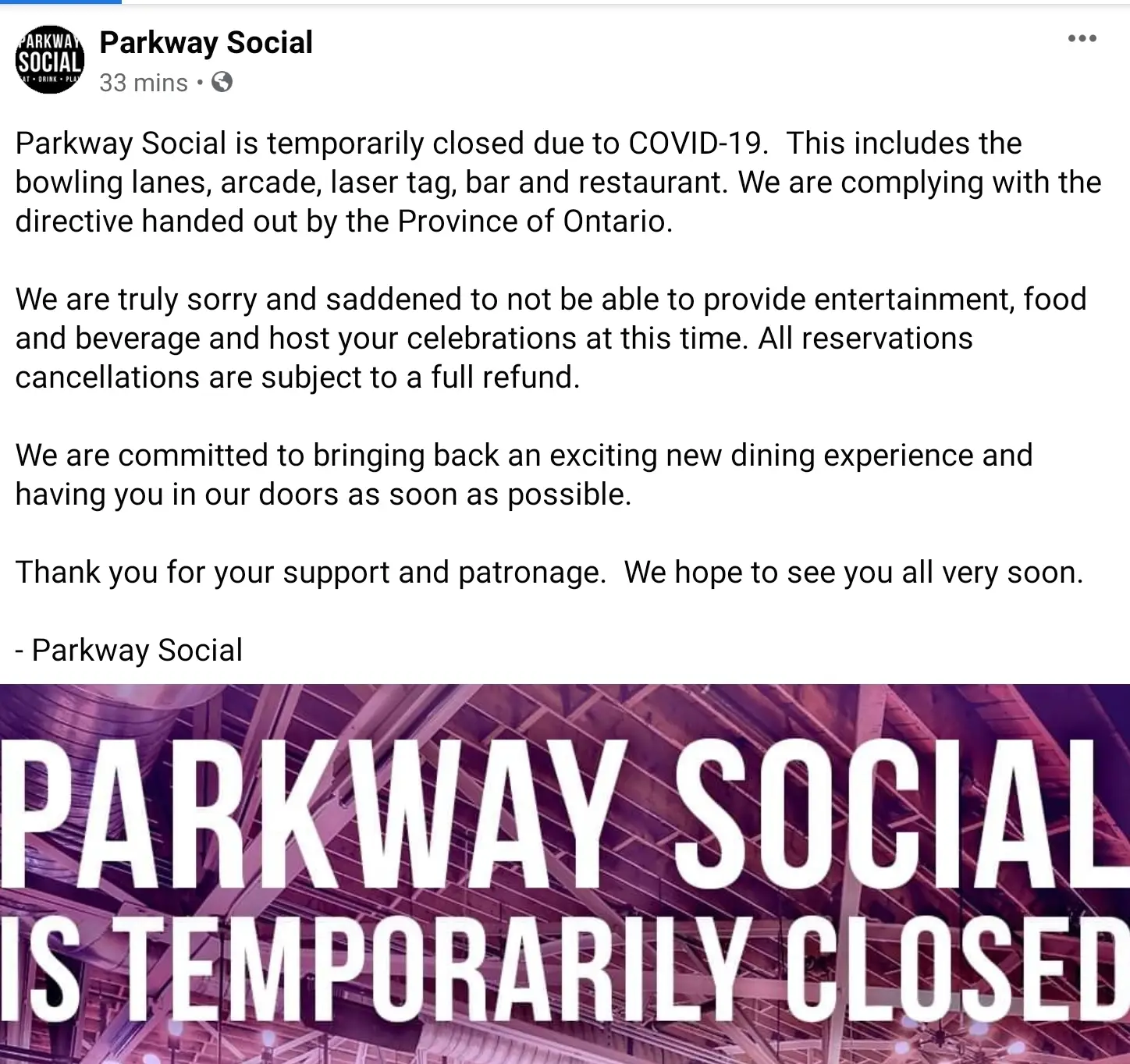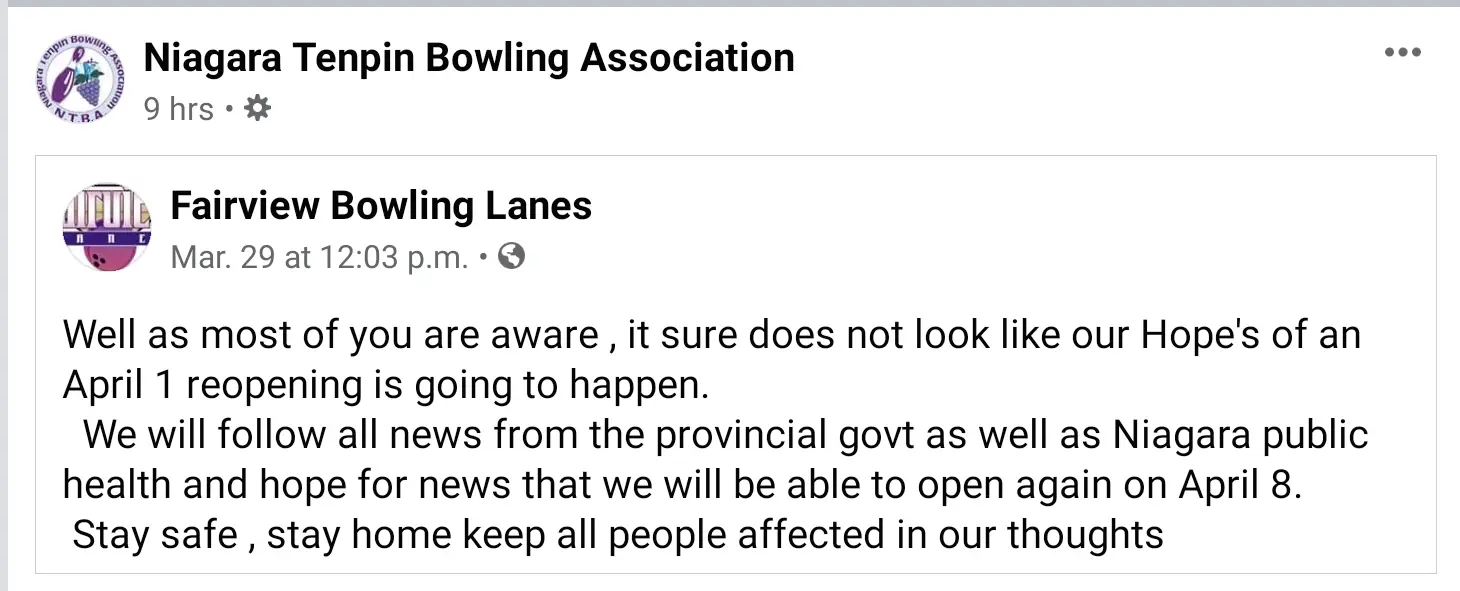 Parkway Social in St. Catharines is leaving the decision to the leagues themselves to decide what they wish to do. Please check with your league executive to see if your league is going to continue to bowl.